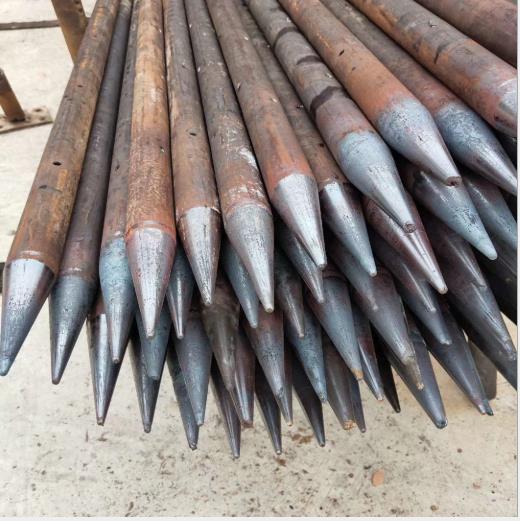 超前小导管一般采用直径38~50mm的无缝钢管制作。在小导管的前端做成约10cm长的圆锥状,在尾端焊接直径6~8mm钢筋箍。距后端100cm内不开孔,剩余部分按20~30cm梅花形布设直径6mm的溢浆孔。